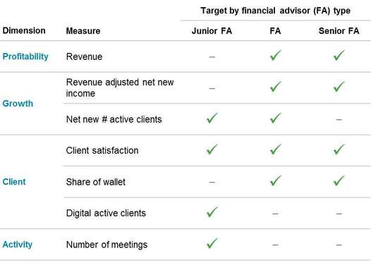 Implementation hurdles can be addressed in part by on the job training and coaching, the identification of internal “change champions,” as well as via compensation structures that embed strategy into incentives; e.g., through KPIs that track volume of digital interactions or contribution to team production targets. These KPIs need not be uniform across the franchise but can be directed to reflect gearing ratios or seniority, as per Figure 3.