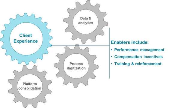 Fixes such as enabling client self-service, the elimination of paper, and the use of decision engines to replace people are only a first step, however. Service architecture must be aligned to customer value delivered. Integration of multiple processes across the platform is essential, both to give the advisor transparency onto underlying workflow, and to shift work from the (expensive) front office to the back.