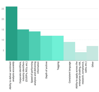 Although there are a wide variety of vendors in this space, a few received top billing from our respondents. The top mentions were for offerings from Refinitiv and Bloomberg, followed by RavenPack, Alexandria, FactSet and Dow Jones.